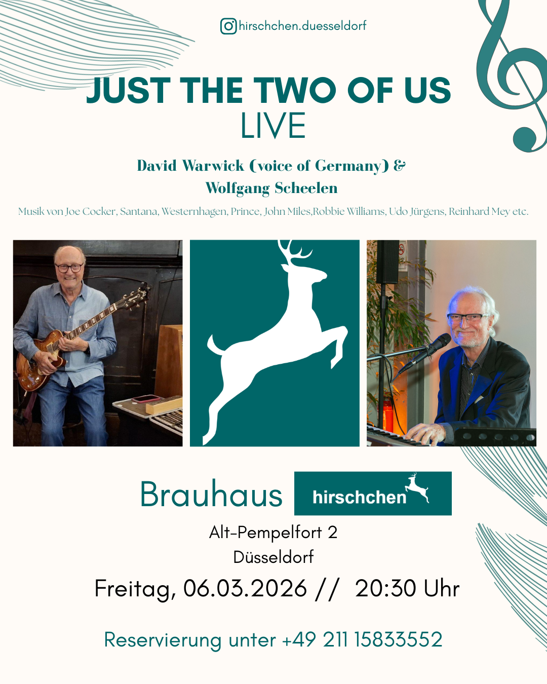 Das Duo “Just the 2 of us” – David Warwick ( voice of Germany) & Wolfgang Scheelen treten zum ersten Mal im Brauhaus Hirschchen auf.